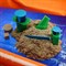 Набор формочек включает в себя 8 предметов, с помощью которых можно строить башни, крепостные стены, винтовые лестницы и прочие элементы средневековых замков. Схема постройки песочной крепости приведена на картинке. Основными инструментами являются два шприца. Вы наполняете их смесью кинетического песка, нажимаете на поршень и получаете строительные блоки кубической или цилиндрической формы. Используя эти "кирпичики" можно построить не только крепость, но и всё, на что хватит Вашего воображения.