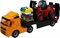 В состав набора входят два автомобиля - трейлер и погрузчик, а также груз. Груз сборный - состоит из элементов пластмассового конструктора. которые уложены на поддон. У автомашины-трейлер опускается трап, что позволяет заезжать на него погрузчику или другим машинкам. У погрузчика поднимается и опускается стрела.