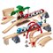 В состав набора деревянной железной дороги BRIO (БРИО) входит двухуровневое железнодорожное полотно с двумя управляемыми стрелками, два пассажирских состава из трёх вагонов, большой арочный мост, светофор, пассажирский вокзал с лифтом, позволяющий поднимать и опускать пассажиров с одного уровня деревянной железной дороги на другой, и пассажиры с багажом. Машинистов поездов можно вынимать из поездов. У пассажиров и машинистов сгибаются ручки и ножки.