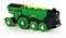 Паровоз железной дороги BRIO (БРИО), зеленого цвета, способен сам ездить по рельсам. На крыше паровоза находится переключатель направления движения. При движении у паровоза горят огни и он издаёт характерные звуки для паровоза, который тянет тяжело гружёный состав (если перевести эти звуки на русский язык, то получится - Чо-Чо-Чо-Чо...