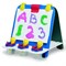 Двусторонний мольберт небольших габаритов имеет две рабочие поверхности - поверхность для рисования мелом и поверхность с бумагодержателем,на которой можно размещать лист бумаги и рисовать маркером, карандашами или красками. С одной стороны мольберта есть 3 отверстия для стаканчиков, с другой - ровная поверхность для раскладывания канцелярских принадлежностей. В комплект мольберта входят пластиковые стаканчики с закрывающейся крышкой (непроливайки) и удобным скатом для отжима кисти, а также кисти для рисования красками.