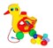 Яркая и занимательная каталка-уточка станет любимой игрушкой Вашего малыша и поможет ему приобрести новые знания и навыки. Игрушка представляет собой сортер, в отверстия которого надо вставлять подходящие по размеру фигурки. При нажатии на кнопку уточка "несет" яйца. Крылья уточки поднимаются.