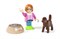 В набор входят фигурка человечка, собака и миска. У человечка сгибаются ручки и ножки, его можно сажать в машинки, в паровозики, ставить в сооружения, качать на качелях и т.п.