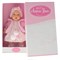 Кукла одета в ярко-розовую вязаную кофточку на завязках с бубонами, летнее платьице с мелким рисунком, на голове куклы - белая шапочка в бантом. На ногах - вязаные пинеточки с бубончиками.