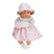 Кукла с пухлыми щечками, у неё соблюдены пропорции тела и воспроизведены все младенческие складочки. Ручки, ножки и головка подвижны. Кукла одета в нарядную одежду: кофточка с муфточкой, теплую шапочку, платьице, на ногах куклы - белые ботиночки на шнурочках. На платьице с помощью пластиковой прищепки закреплена соска.