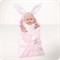 Кукла одета в боди с бантиком, на голове украшение – атласная ленточка. Спальный аксессуар – мягчайший конверт из флисовой ткани с объемным узором и забавным декором – большими заячьими ушами.