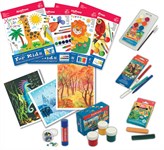 Данное пособие позволяет развивать творческие способности ребёнка с 5 лет. Оно содержит 32 рисунка-эскиза, на которых нужно что-то дорисовать, слепить или наклеить. С их помощью ребёнок узнает, как лепить из пластилина, рисовать гуашью, акварелью и восковыми мелками, делать аппликацию, в том числе из ватных дисков. В набор входят все материалы, необходимые для работы, фирмы Erich Krause.