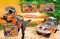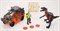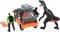 В комплект набора входит фигурка динозавра (двигающаяся), фигурка охотника, автомашина (джип) с утановленной на ней пушкой. Пушка может стрелять дисковыми снарядами. Фигурка динозавра и охотника - двигающиеся.
