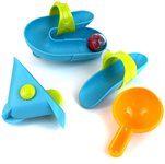 Забавный набор игрушек из маленьких пластмассовых горочек ярких цветов, шарика и совочка сделает купание малыша настоящим праздником. Детальки горочки (пандусы) крепятся к кафелю с помощью липучек, выстраивая собой форму горки для воды. Зачерпнув совком воду и вылив её в верхний пандус, можно наблюдать как весело вода бежит по построенному для нее пути! Малыш сможет построить водяную мельницу прямо на стенке и наблюдать за тем, как вода льется по построенному его ручками маршруту. Экспериментируя, малыш разовьет логическое и пространственное мышление, и мы уже не говорим о том, что это безмерно весело!