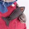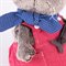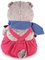 Басик в симпатичном комбинезоне в тетрадную клеточку из хлопчатобумажной ткани цвета сочной малины. Комбинезон сшит на лямочках и с двумя накладными кармашками. В комплекте — шейный хлопковый платочек василькового цвета в мелкий белый горошек. В лапках у кота забавная рыбка из тонкой замши графитового цвета.