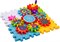 Конструктор на шестеренках "Калейдоскоп" BONDIBON представляет собой динамический конструктор из фигурных оснований в виде блок-пазлов со штырьками и разноцветных шестерёнок разных размеров. Шестерёнки соединяются и взаимодействуют друг с другом. Основная задача - построить конструкцию для создания подвижного механизма. Нужно располагать шестерёнки на игровом поле таким образом, чтобы они все крутились. Одна из шестерёнок имеет ручку, за счёт чего собранную композицию удобно крутить. Из деталей конструкторв можно создавать рабочие механизмы разного уровня, от простых к более сложным. В процессе игры ребенок познакомится с принципам механики крутящихся шестерёнок и с таким понятием как зубчатое колесо. Количество деталей: 28