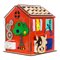 На передней стороне дома расположены несколько распашных дверок, закрывающиеся на разного типа замочки. Все эти дверцы открываются и дают доступ во внутреннюю часть домика, в котором целых 2 этажа. Этот дом отлично подходит для сюжетно-ролевых игр: внутри могут поселиться фигурки животных, которые идут в комплекте с бизи-домом. Ребёнок всегда может проявить фантазию и создать из бизи-дома не ферму, а что-то своё девочки там могут сделать кукольный домик с мебелью, а мальчики превратить его в гараж для своих машинок.